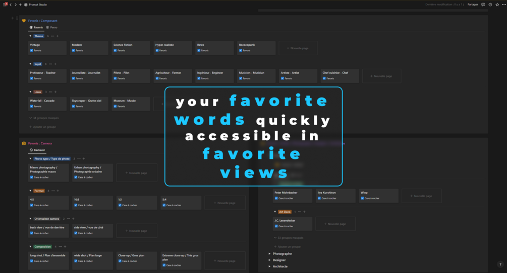 - Use favorites & visual palettes to build prompts in just a few clicks.